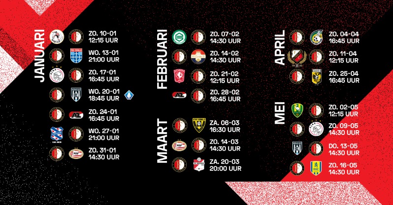 W niedzielę wyjazdowym meczem ze Spartą Feyenoord rozpocznie bardzo pracowity miesiąc. W środku tygodnia odbędzie się mecz u siebie z PEC Zwolle przed Klasykiem Ajax - Feyenoord w dniu 17 stycznia. Oprócz meczów z Heraclesem i SC Heerenveen, zespół z Rotterdamu w styczniu zagra ponadto przeciwko AZ i PSV.