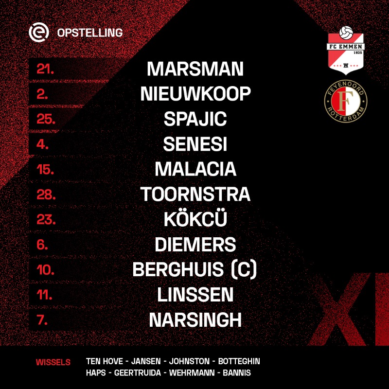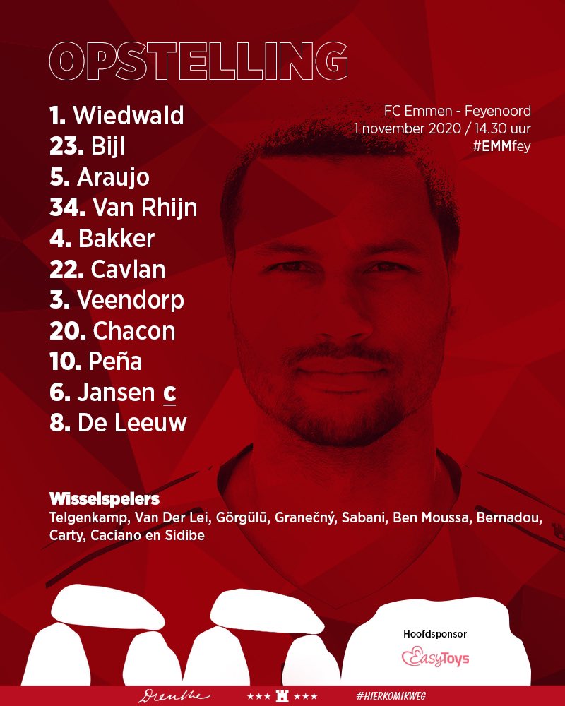 Znamy już składy w jakich wyjdą FC Emmen i Feyenoord. Portowcy zagrają dzisiaj bez Justina Bijlowa, który jest poobijany po ostatnim meczu w Lidze Europy oraz bez Ridgenacio Hapsa.