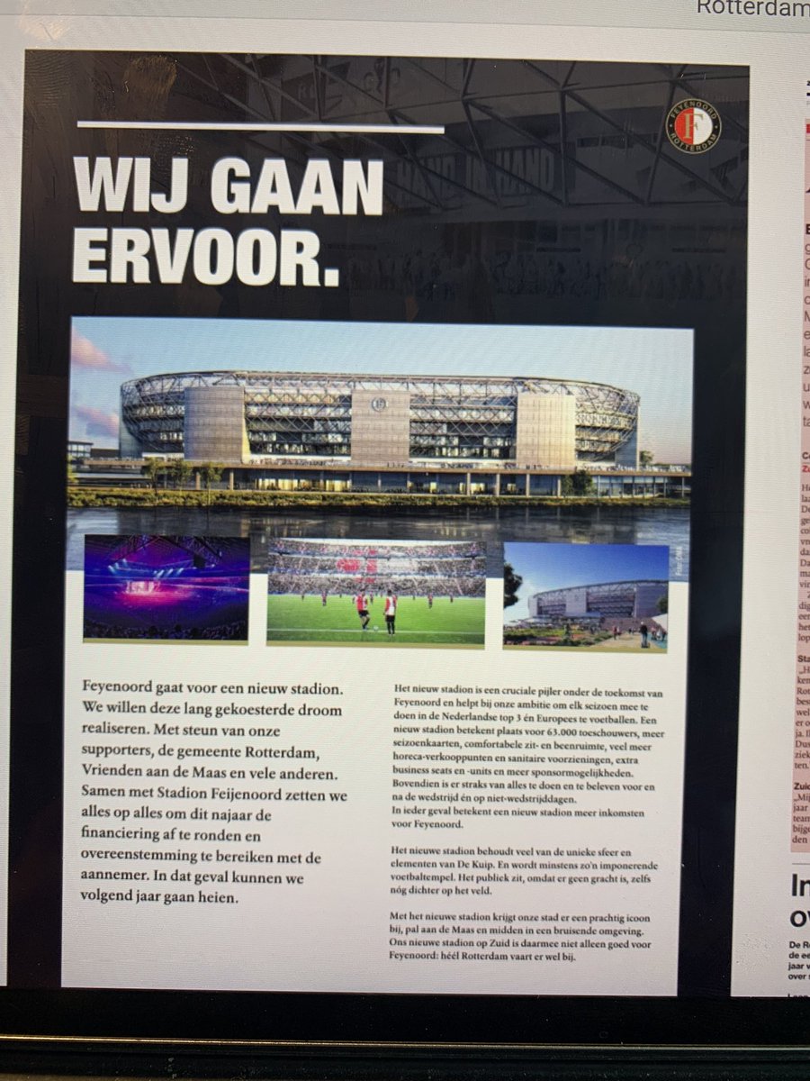 W kilku gazetach, w tym Algemeen Dagblad, Feyenoord potwierdził, że chce przenieść się na nowy stadion i wszystko jest już ustawione na ten kierunek. Duża reklama, z ilustracjami nowego stadionu, znajduje się na stronach dzisiejszych wydań holenderskich mediów.