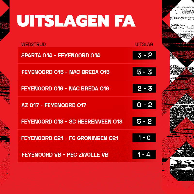 Wiele bramek zdobyły również drużyny Feyenoordu U-16 i Feyenoord U-15, które zmierzyły się u siebie z NAC Breda. Dla Feyenoordu u-15 było to udane zwycięstwo 5-3. Feyenoord U-16 przegrał 2-3.