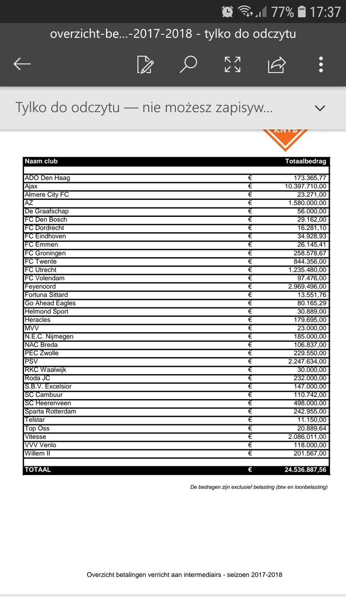 Feyenoord wydał prawie trzy miliony euro na prowizje menadżerskie w sezonie 2017/2018. Od trzech lat KNVB publikuje dane, które pokazują, ile kluby płacą agentom. Rotterdamczycy pod tym względem są na drugim miejscu w Holandii.