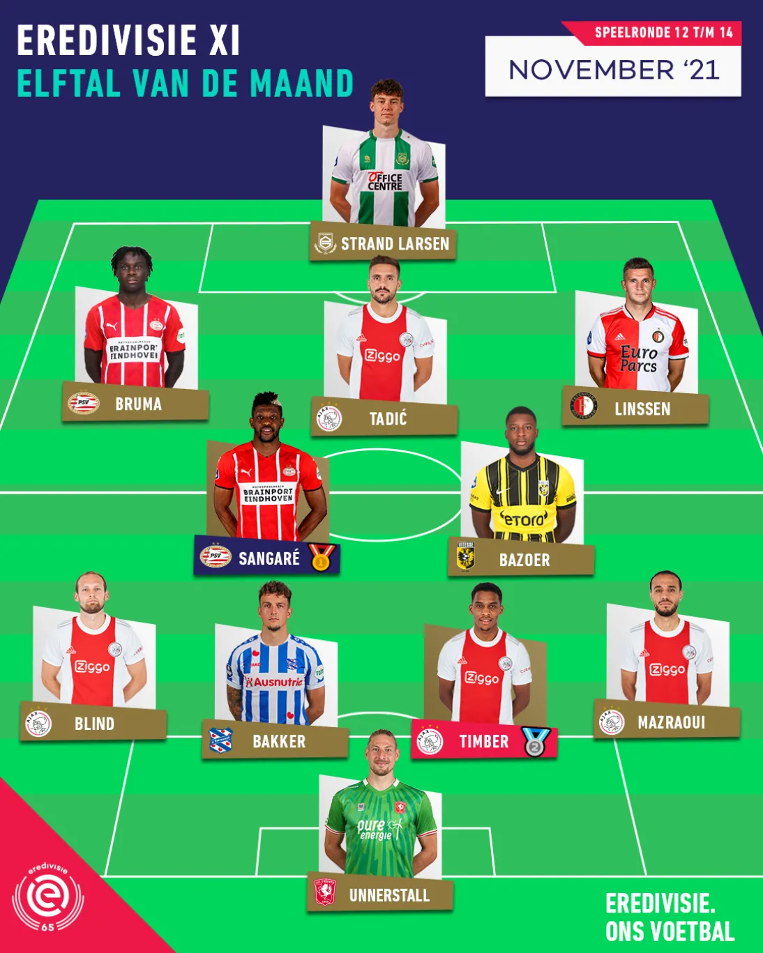 Dzisiaj poznaliśmy drużynę miesiąca za listopad. Bryan Linssen jest jedynym graczem Feyenoordu, który znalazł się w najlepszym zespole.