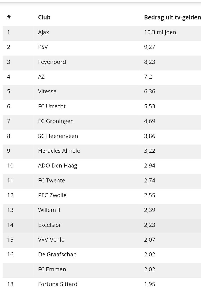 Magazyn Voetbal International opublikował już ranking podziału praw telewizyjnych w Eredivisie na sezon 2019-2010. W sumie do podziału będzie około osiemdziesięciu milionów euro. Feyenoord zajmuje trzecie miejsce w rankingu i może liczyć na kwotę 8,3 miliona. Przypominamy, że o tym, ile dany klub otrzyma, decydują wyniki z dziesięciu ostatnich lat.