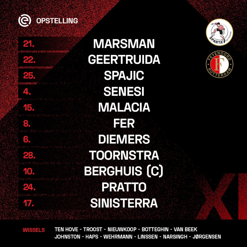 Lucas Pratto zadebiutuje dzisiaj w barwach Feyenoordu. Do wyjściowego składu, po wielu miesiącach rehabilitacji, wraca Luis Sinisterra. W ekipie gospodarzy od pierwszych minut wyjdzie wypożyczony z Feyenoordu Wouter Burger.