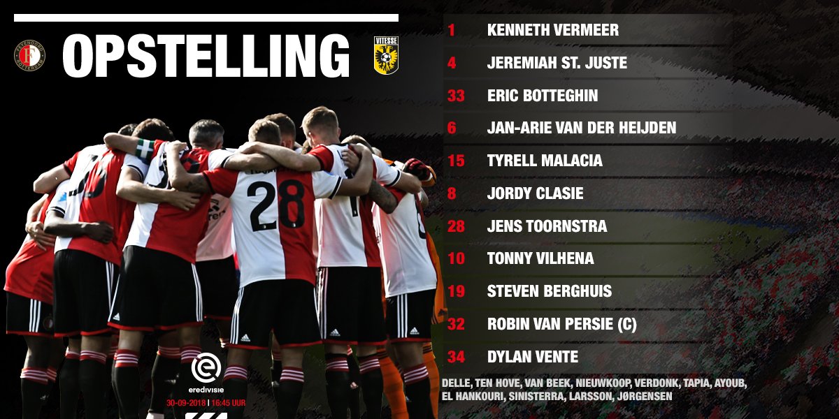 Giovanni van Bronckhorst był zmuszony dokonać dwóch zmian na dzisiejszy mecz z Vitesse. W bramce stanie Kenneth Vermeer, bowiem urazu nabawił się Justin Bijlow. Z kolei mającego również ostatnio problemy zdrowotne Sama Larssona zastąpi Dylan Vente.