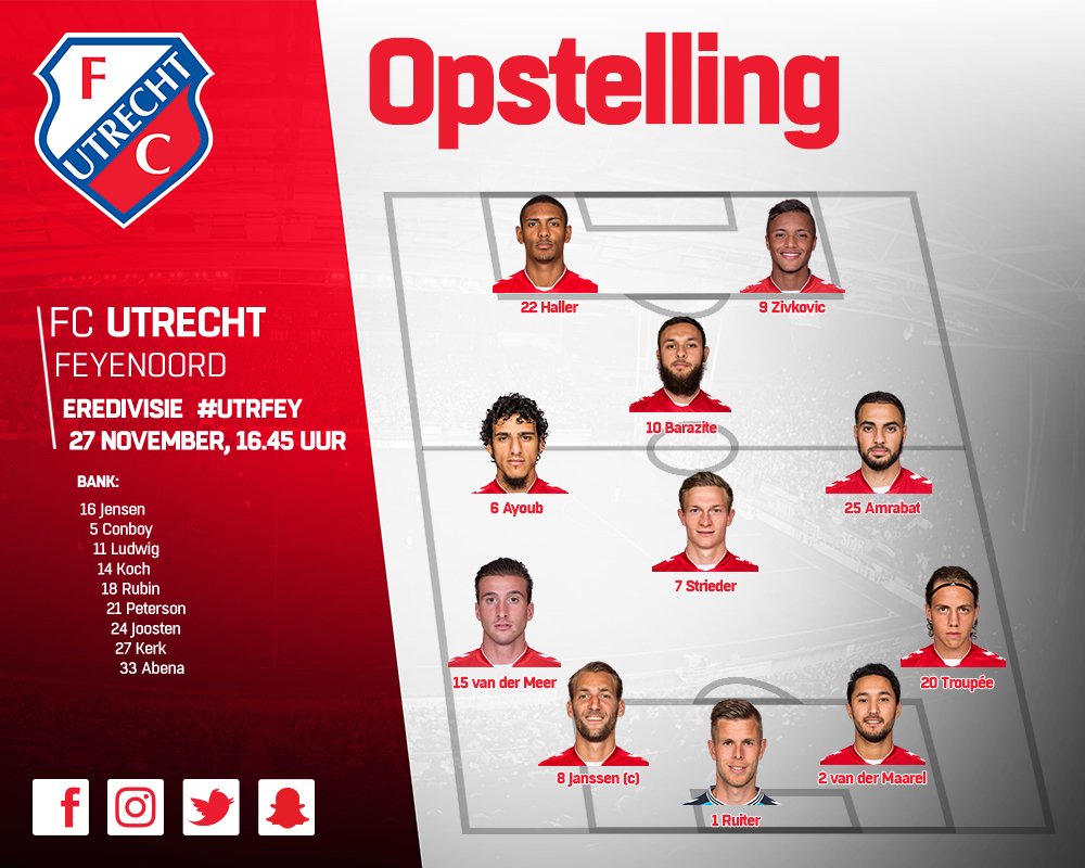 O 16:45 FC Utrecht podejmie na Galgenwaard Feyenoord w 14 kolejce Eredivisie, zatem czas przedstawić składy tego spotkania: